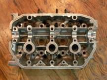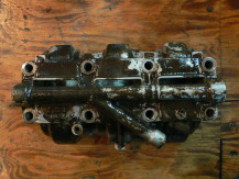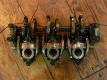 | (上図)バルブを一本づつ丁寧にすり合わ せた後、コンパウンドを完全に取り除く。 (どのバルブが、どのシリンダーの、どこに 位置するかを正確に管理) (下図)洗浄前のバルブ。 カーボンスラッジが付着している。 |