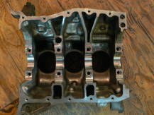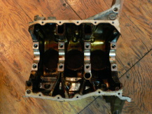 | (上図)シリンダーブロック内径を測定し、 さらに摩耗点検。測定値が限度値以上 の場合は、ボーリングしてシリンダー内径を 広げ、オーバーサイズのピストン(HONDA 純正部品)及びピストンリングを使用する。 (上図)シリンダーにピストンを挿入。 (ボーリング作業にはかなりの時間が必要) (下図はボーリング後の写真) |