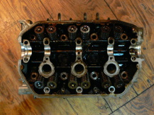シリンダーヘッドにバルブを組付け。 専用工具を使ってバルブスプリングを人為的に 収縮固定し、コッタ(スプリングエンドの固定 部品)を取付け。 |